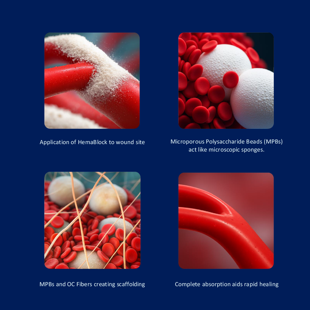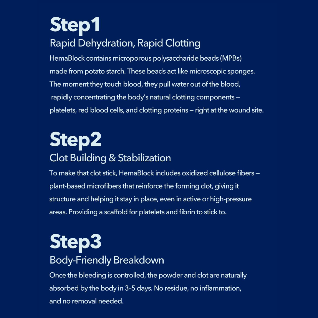 This sterile hemostatic powder is formulated to control arterial, venous, profuse, and diffuse bleeding in a wide variety of surgical, dental and topical procedures. The active ingredients are Microporous Polysaccharide Beads (MPB) derived from potato starch microscopic particles combined with Oxidized Cellulose (OC) micro-fibers derived from cotton. All natural plant compounds that break down quickly in s wound site.